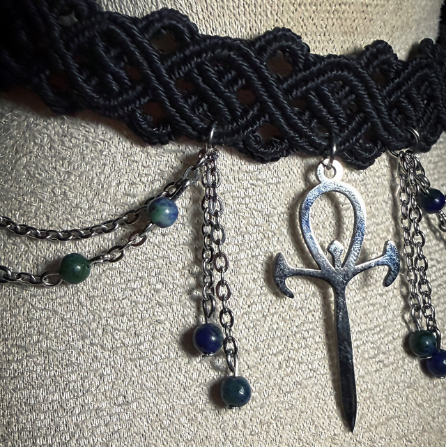 Entièrement tissé à la main en macramé, ce collier se porte comme un choker rituel, puissant et élégant. Les éléments en acier inoxydable garantissent résistance et durabilité au quotidien.