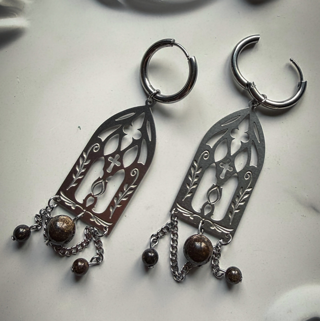 🦇Les boucles d’oreilles ELLEN conjuguent mysticisme médiéval et élégance gothique grâce à leur structure en acier inoxydable finement découpée, rappelant les fenêtres de cathédrales anciennes. Chaque pièce est ornée de véritables pierres de bronzite, dont les reflets chauds et métalliques évoquent les talismans protecteurs d’autrefois. Les petites chaînes et perles suspendues ajoutent un mouvement délicat, créant une aura enchantée à chaque geste. Hypoallergéniques, durables et uniques, les ELLEN incarnent la fusion parfaite entre enchantement fantasy et sophistication alternative, idéales pour sublimer un style dark, médiéval ou witchy.