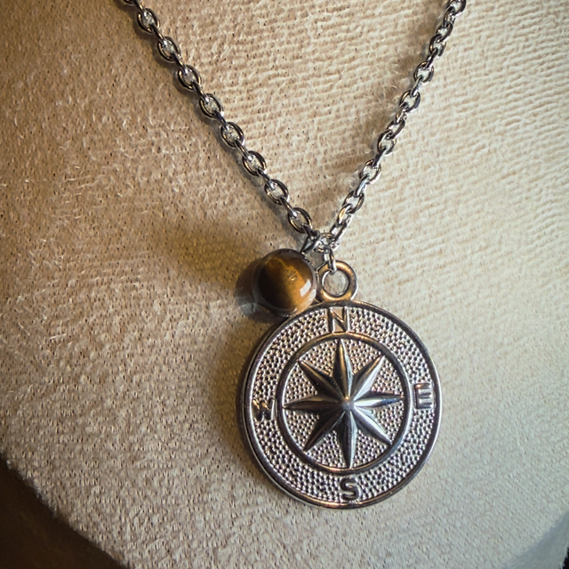 Collier classique boussole pierre œil de tigre Et acier inoxydable argent